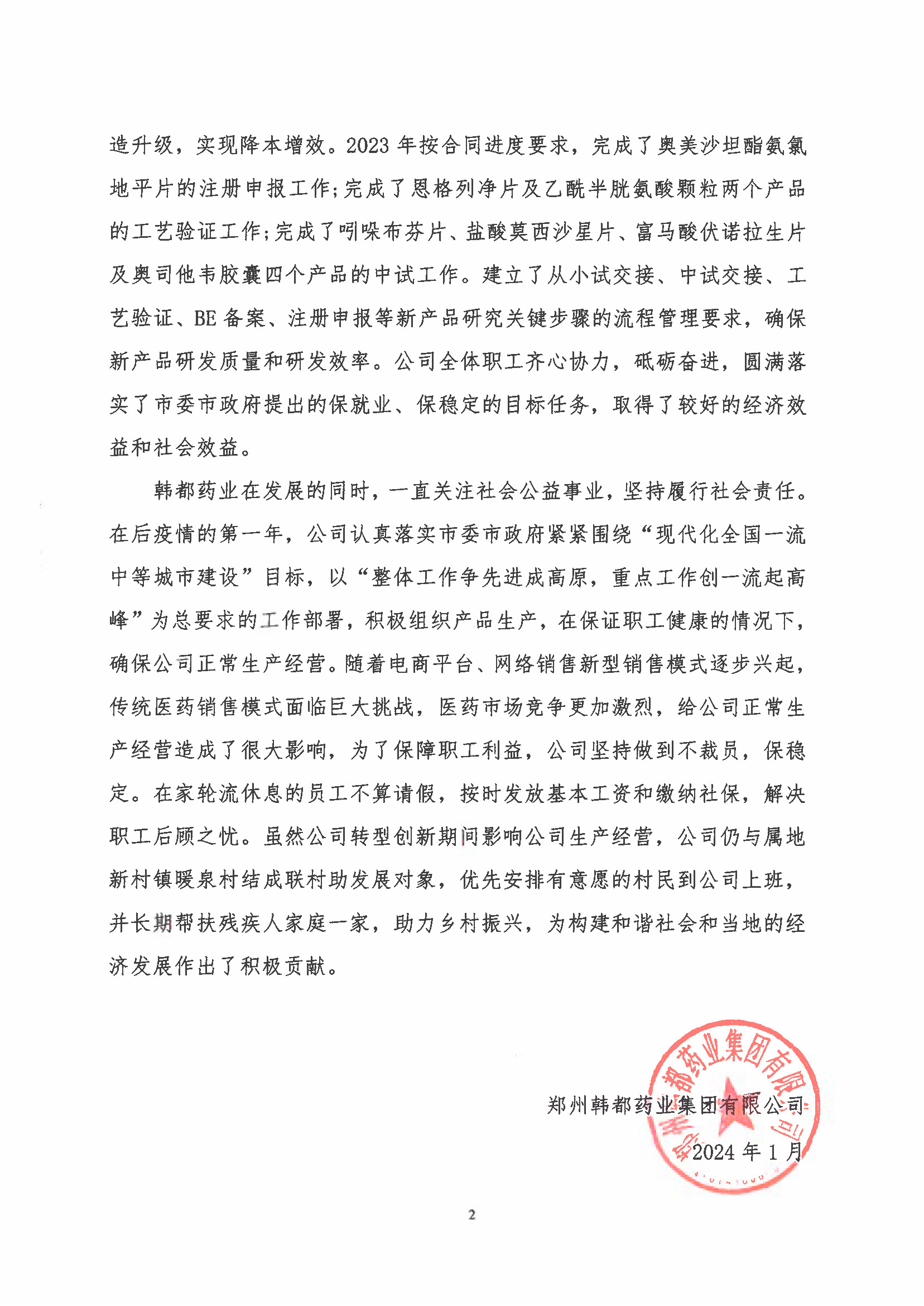 生产经营带来极大困难。针对这种情况,公司领导坚持以科技为引领,以创新为驱动,投资2600多万元对设备进行改造升级,实现降本增效。2023年按合同进度要求,完成了奥美沙坦酯氨氯地平片的注册申报工作;完成了恩格列净片及乙酰半胱氨酸颗粒两个产品的工艺验证工作;完成了吲哚布芬片、盐酸莫西沙星片、富马酸伏诺拉生片及奥司他韦胶囊四个产品的中试工作。建立了从小试交接、中试交接、工艺验证、BE备案、注册申报等新产品研究关键步骤的流程...